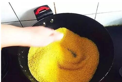 今天的米成色不错,我没有洗。全程小火,先将铁锅均匀预热,然后倒入一部分米,开始炒制。我直接用手翻炒的,感觉这样能更直接的感受米的温度,可防止小米过热或炒糊。米炒到用手拿起来能闻到浓郁的谷物香气即可。米多锅小,一共炒了4锅。